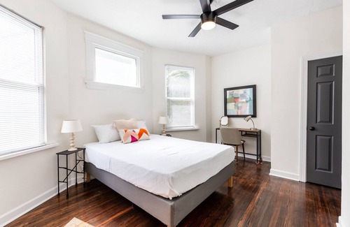 After a day out and about exploring the city, enjoy your down time streaming a movie or your favorite show in the living rooms featuring smart TVs and comfortable sofa and seating options. Rich, dark hardwood flooring runs throughout the home in the lower-level unit, accented by calming neutral tones and bold pops of color. In the upper unit, the spacious living and dining areas can accommodate a crowd when you wish to gather the whole group together. Fully equipped kitchens in each home feature stainless steel appliances, coffee makers, and a full suite of cookware and dining ware for the convenience of making meals at home. The upstairs dining table offers seating for 6 to share food, play games, or spend quality time together, or you can take casual bites in the lower unit at the kitchen counter with barstool seating for 2. For some fresh air any time of day, grab your coffee or an evening cocktail and pop out onto the front porch, featuring additional outdoor seating for 2.