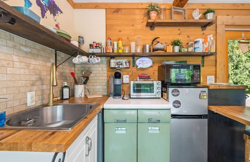 The container is equipped with a private Queen bed and spacious unique bathroom. The fully stocked kitchen is complete with a hot plate, toaster oven, Keurig plus coffee and a large mini refrigerator, grill plus propane. The bar top rests upon an old bicycle frame. The container offers Paid wifi but no TV. It has all of the other modern amenities! There are books, magazines, board games and cards!