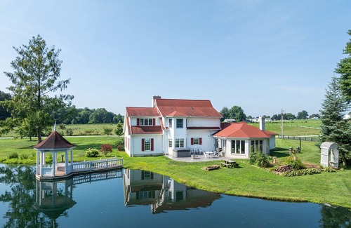 You are sure to see horse and buggies pass by on this quiet country road while you take a stroll over the bridge and feed the fish, or relax under the shade trees in the backyard.