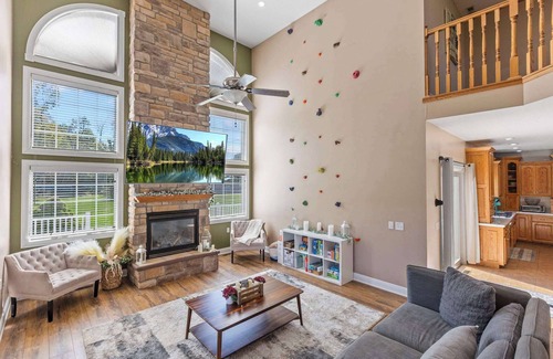 This home features an open-concept design with a spacious living room and a fully equipped kitchen, perfect for family gatherings and events. The main floor includes two bedrooms, one being the master suite with a soaking tub (please note the jets are currently not operational). The second main-floor bedroom, located next to the master, has two twin beds. Upstairs, you'll find three additional bedrooms—two with queen-size beds and one with a full-size bed—sharing a single bathroom. A large loft area overlooks the downstairs fireplace and rock-climbing wall, adding to the home's open and inviting atmosphere.