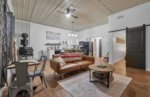 Family friendly barndominum is great for small groups and families. This two bedroom has a spacious living room, private patio with hot tub and seating area, and access to the campgrounds group fire pit, grill, and pavilion.