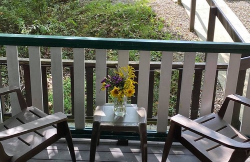 The cabin is in the woods. There are lighted stairs and bridges going up the hillside to a covered porch with Adirondack chairs so you can sit on the porch and listen to the creek below and the wind rustling through the leaves. There's a concrete patio with a picnic table and a charcoal grill. When you step through the door there are lovely wood walls, an electric fireplace, and your eye will go straight to the French doors leading onto the screened hot tub porch with billowy curtains for privacy. There's a queen size bed with fluffy rugs on either side, end table and armoire with extra pillows and blanket, for your convenience. The living area has a leather love seat made just for snuggling in front of the fireplace. There are fluffy throws in the ottoman. Wrap up and watch a movie. There is a Blu-ray/DVD player and antenna The kitchen is well equipped with dishes, glasses, coffee mugs, flatware, basic cookware, coffee pot, toaster, microwave, stove, oven, and refrigerator. We provide all the linens. There is a roomy shower in the bathroom with soap, toothpaste, mouthwash, shampoo, and conditioner.