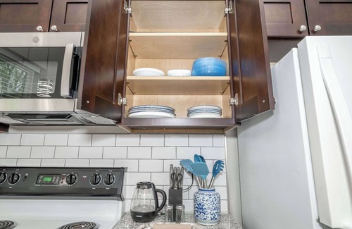 Step inside and let the space welcome you in. The living room offers a cozy place to unwind with a plush couch, smart TV, and a selection of board games for casual nights in. The adjoining kitchen is both sleek and warm, featuring dark brown cabinetry, cool stone countertops, and everything you need to whip up a great meal—including a Keurig for your morning brew. Whether you're enjoying takeout from a local restaurant or a home-cooked dish, the dining table for two offers an intimate setting for meals. At night, the bedrooms become restful retreats, outfitted with room-darkening shades to ensure a peaceful night's sleep, no matter your schedule.