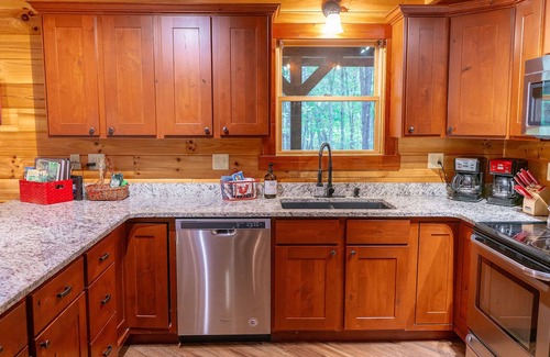 The kitchen features everything needed to prepare a meal. Enjoy a dinner "at home" at the custom made dining table or breakfast bar. There is a gas grill out on the deck or ask us about catering options if you'd rather leave the cooking to someone else.
