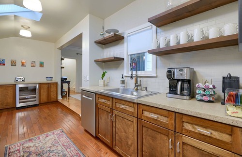 Inside this cozy yet spacious cottage you will find high end finishes everywhere. The large galley kitchen is outfitted with a Kitchenaid Refrigerator, Kitchenaid Double Oven, Kitchenaid Under Counter Wine Cooler, Bosch 5 Burner Gas Cooktop, Bosch Dishwasher and professional grade cooking equipment.
