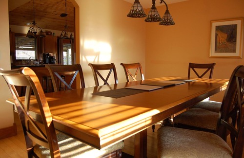 Enjoy plenty of gathering space in the cathedral ceilinged living room open to the gourmet kitchen, separate dining room with seating for twelve at the grand table (high chair provided for your smallest guest), family room, gameroom, and private pub. In all, our lodge features three large flat-screen televisions with Direct TV and Blu-Ray players for your entertainment. A smaller TV sits above the 10 foot bar in the pub, so you won't miss a thing while shooting that game of pool. Of course you can watch the game!! Cozy up to the wood burning fireplace in the living room and soapstone stove in the family room. The Pub boasts a pool table, a ten foot bar, a full sized fridge for snacks and beverages, and a gas log fireplace. The attached game room offers ping pong, foosball, air hockey, and double shot basketball game.