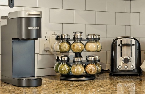 The inviting living area is perfect for gathering after a day out, with stylish décor and comfortable seating. Play some cards or Catan around the coffee table while enjoying your favorite beverage